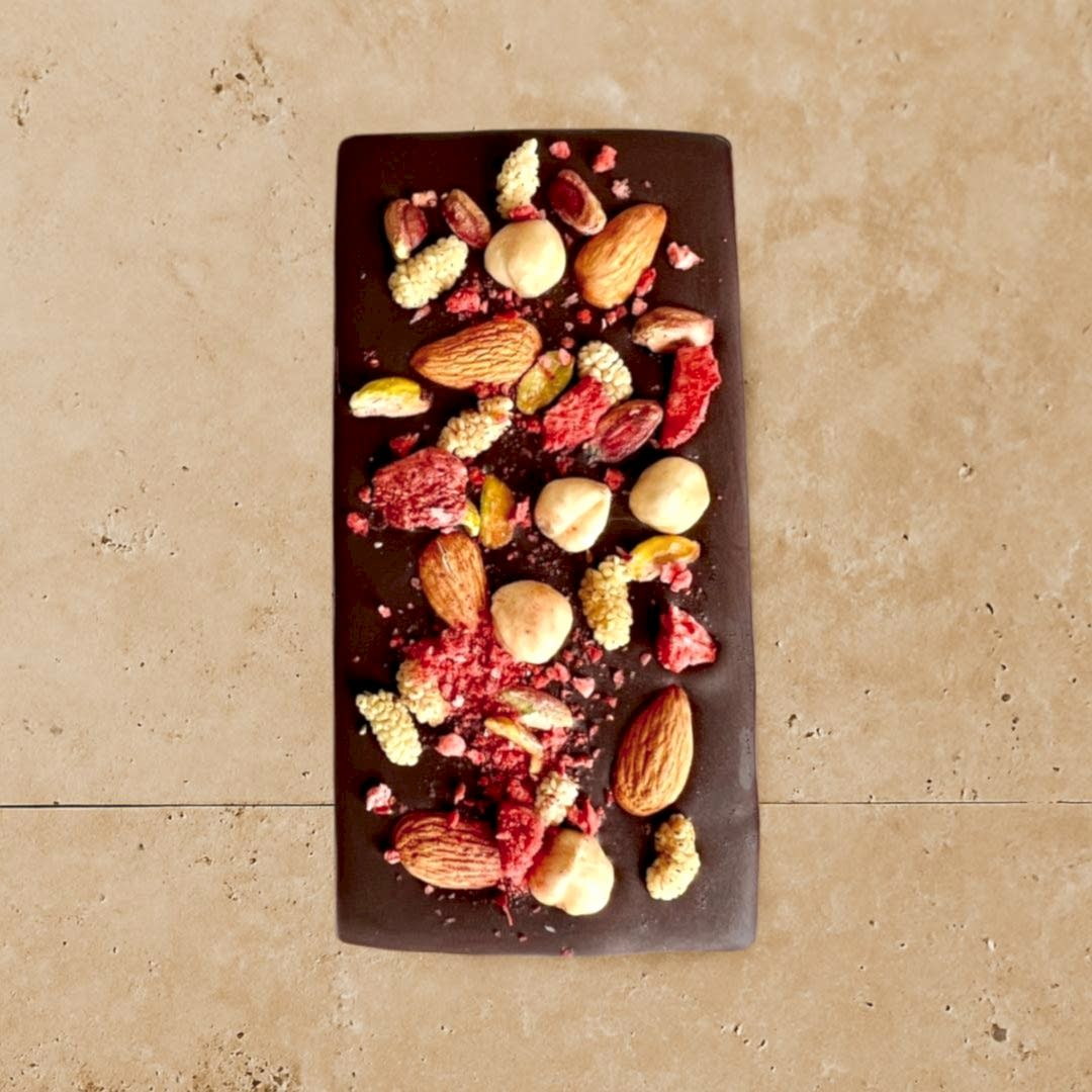 Fındık, Badem, Antep fıstığı, Kuru dut ve çilekle Beechocolate sağlıklı çikolatanın mükemmel buluşması.