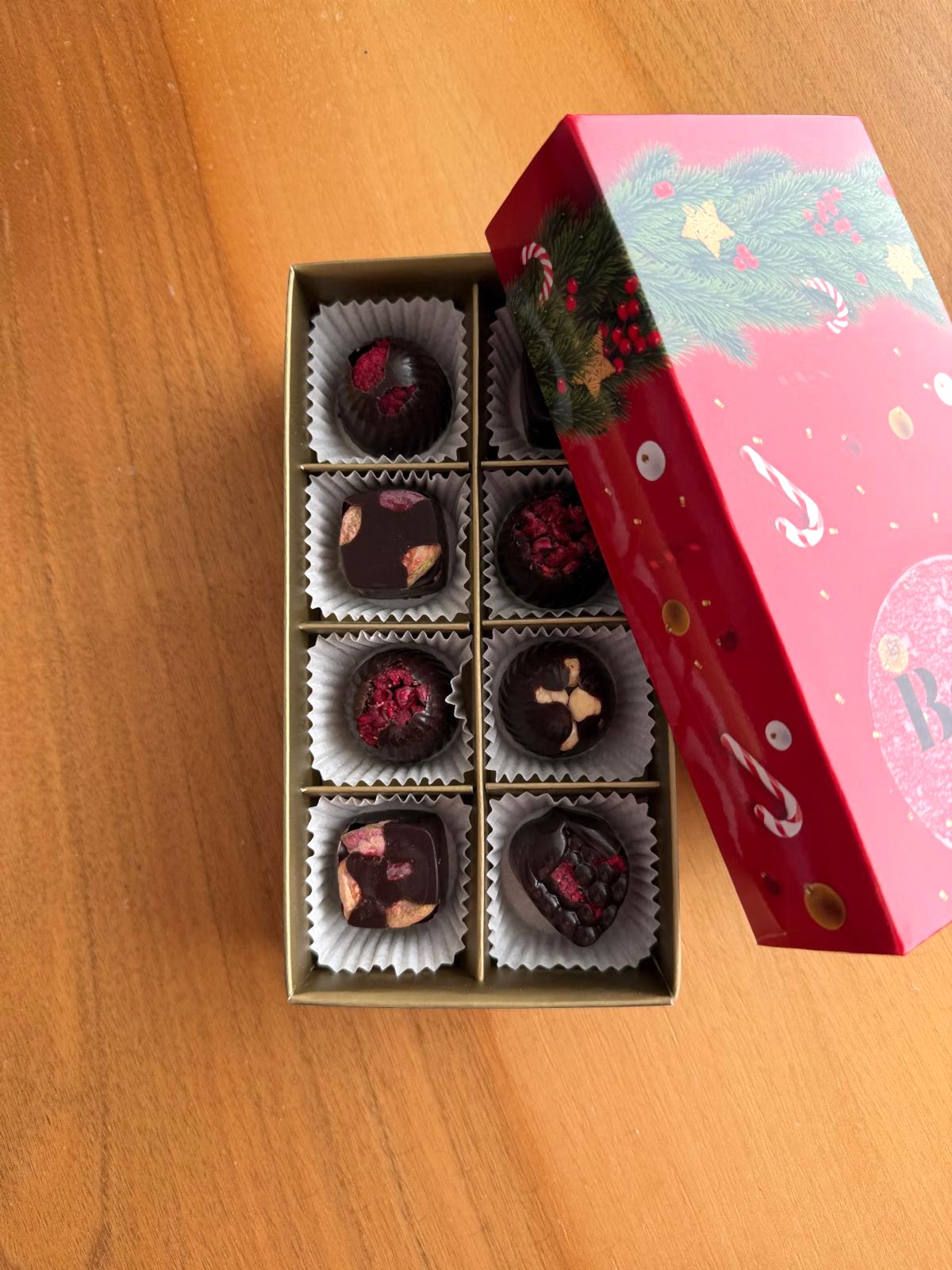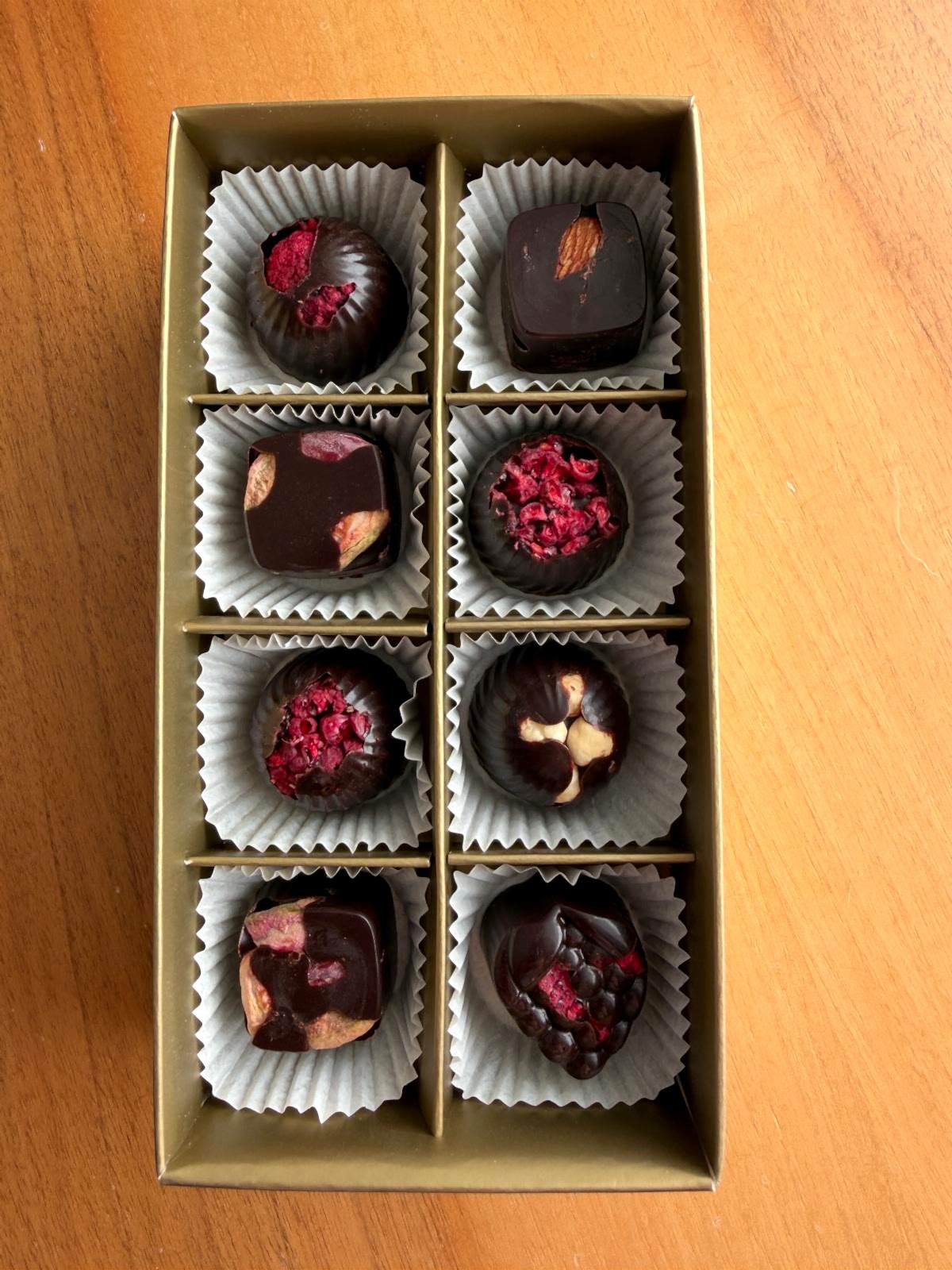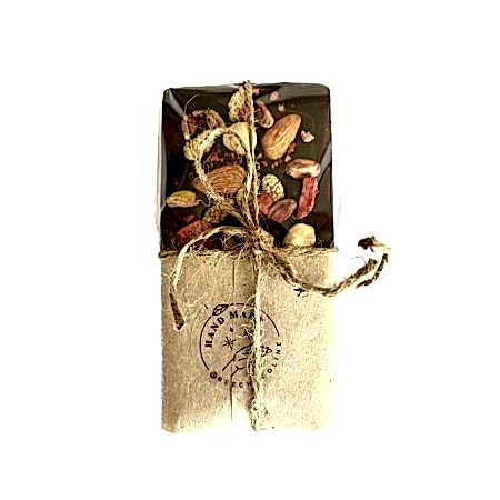 Tamamen el yapımı, kakao, kakao yağı ve tatlandırıcı olarak bal veya hurma kullanılmıştır.